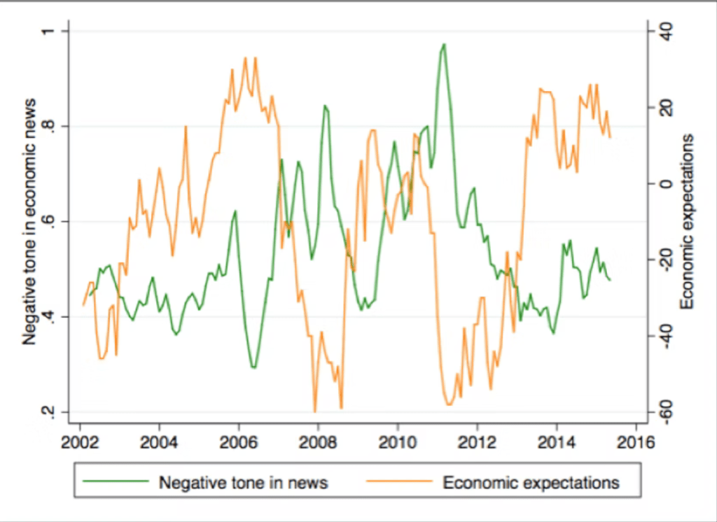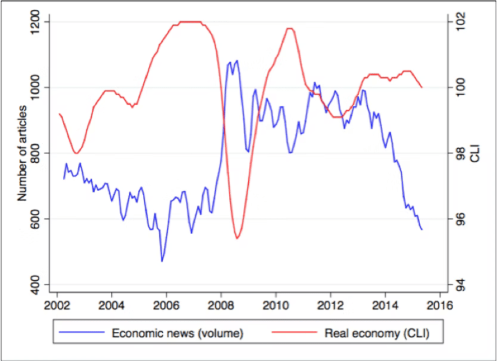 So economic news is important. But how objective is it? Previous studies have suggested a negativity bias in economic news reporting: volumes go up when the economy goes down, and the content tends to be disproportionately negative (see this literature review by Mark Boukes, Rens Vliegenthart and me).